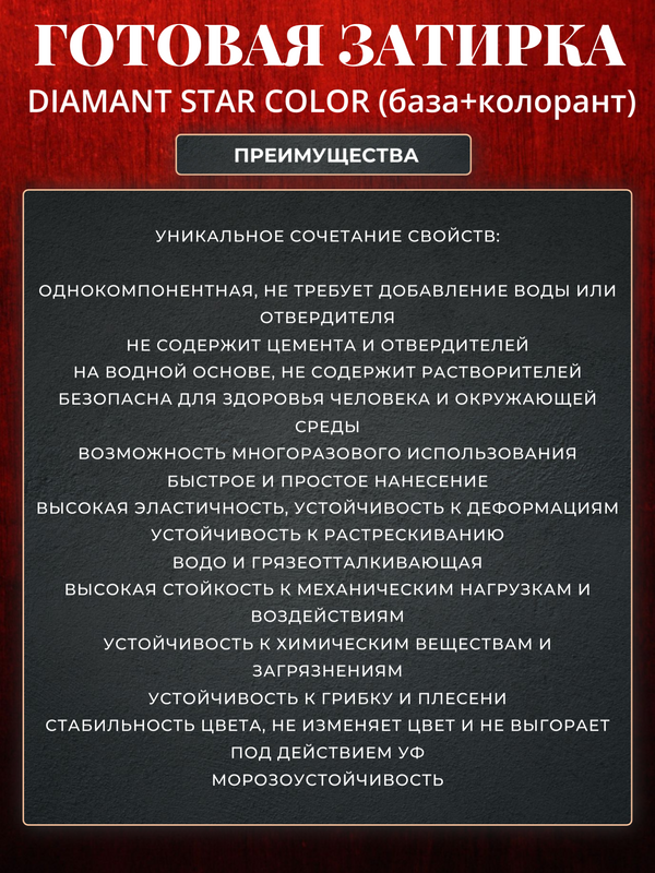 ВНИМАНИЕ: Затирка поставляется как база под колеровку и колеровочная паста в блистере Поставка 1 затирки База+Колорант выбранного цвета НОВАЯ СЕРИЯ ГОТОВЫХ ЗАТИРОК DIAMANT STAR COLOR. Новые Цвета- стало больше и интереснее Улчушенная формула- стала мощнее. долговечнее. Для швов от 1 до 12 мм. Готовая к применению. не требует добавление воды или отвердителя. НЕ СОДЕРЖИТ ЦЕМЕНТА И ЭПОКСИДНЫХ СМОЛ. Эластичная Не трескается Водо и грязеотталкивающая Стойкая к механическим нагрузкам Устойчива к химическим веществам и загрязнениям Устойчива к грибку и плесени Не изменяет цвет и не выгорает Не требуется специальных средств для очистки плитки Для внутренних и наружных работ. Для всех типов мозаики, керамической плитки, керамогранита, клинкера, изделий из натурального и искусственного камня. Использование с системами теплый пол. ЖИЗНЕСПОСОБНОСТЬ НЕОГРАНИЧЕННА. начало эксплуатации во влажных помещениях 7 суток. устойчивость к пятнам и загрязнениям 7 суток. Нанесение и ввод в эксплуатацию согласно инструкции по применению. Колерованная продукция не подлежит возврату и обмену. Внимание! В хаммамах (на полах), чашах бассейнов и фонтанов, душевых поддонах (из плитки, мозаики, камня), на горизонтальных поверхностях снаружи помещения, а именно на открытых площадках, террасах, дорожках и т.д., при постоянном и длительном контакте с водой возможно использовать только при дополнительной обработке швов специальной пропиткой Diamant Star lvl.99